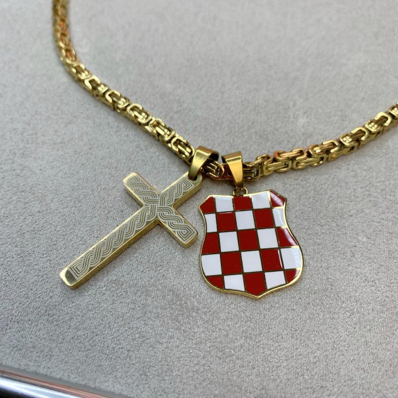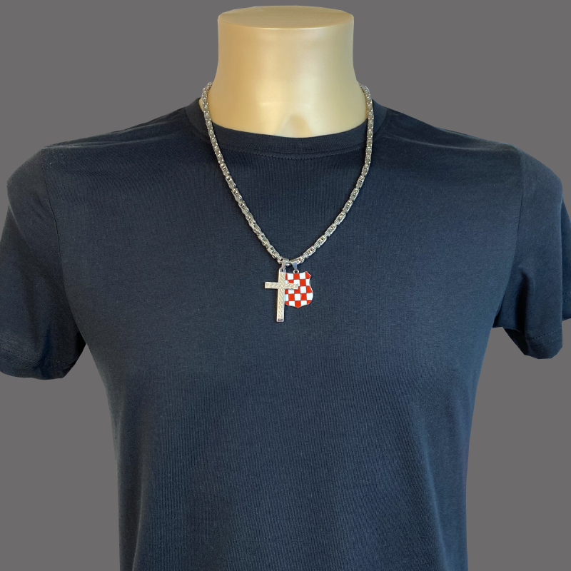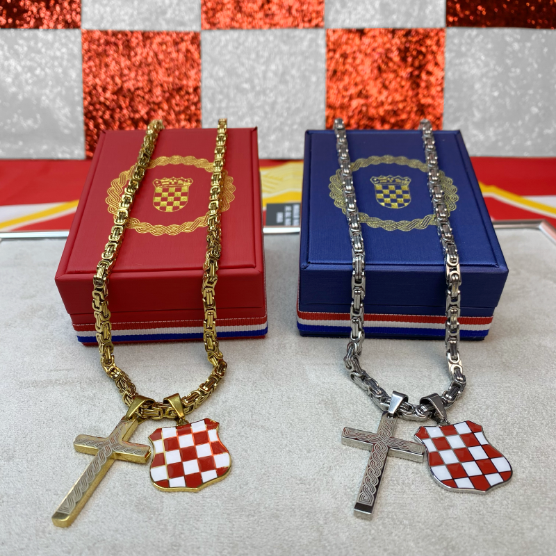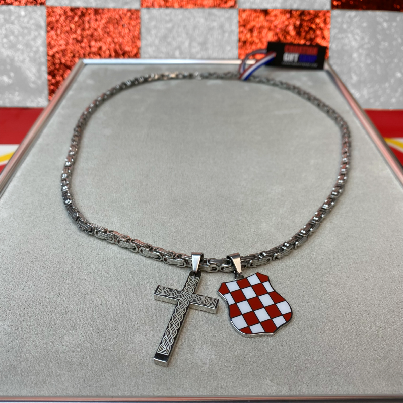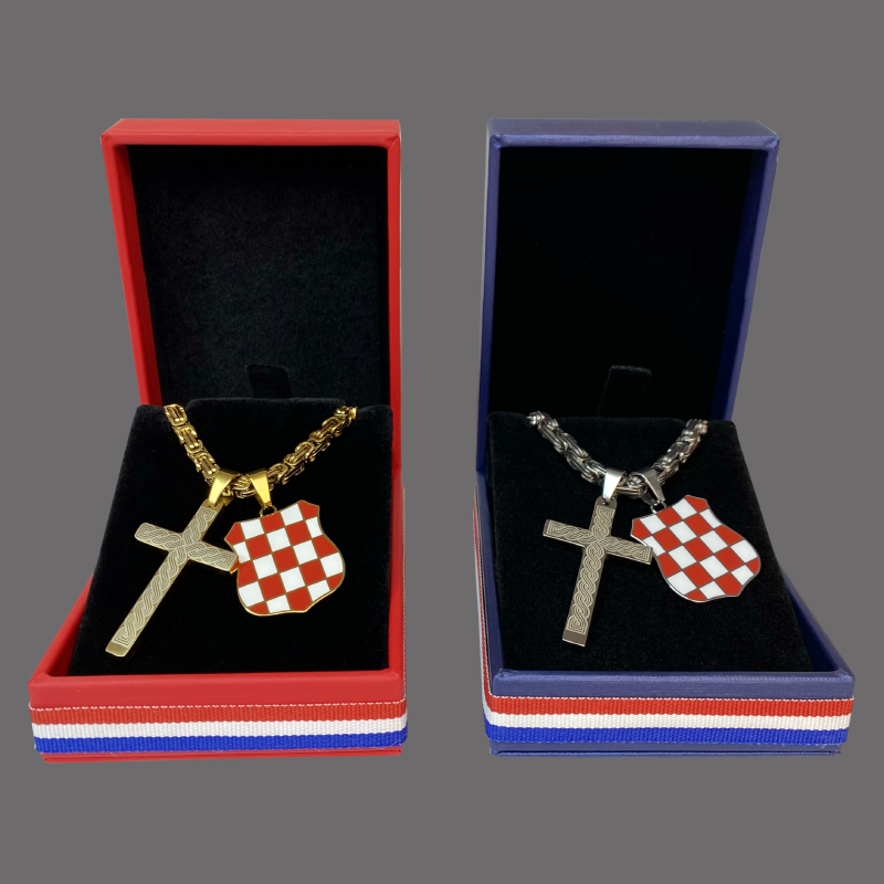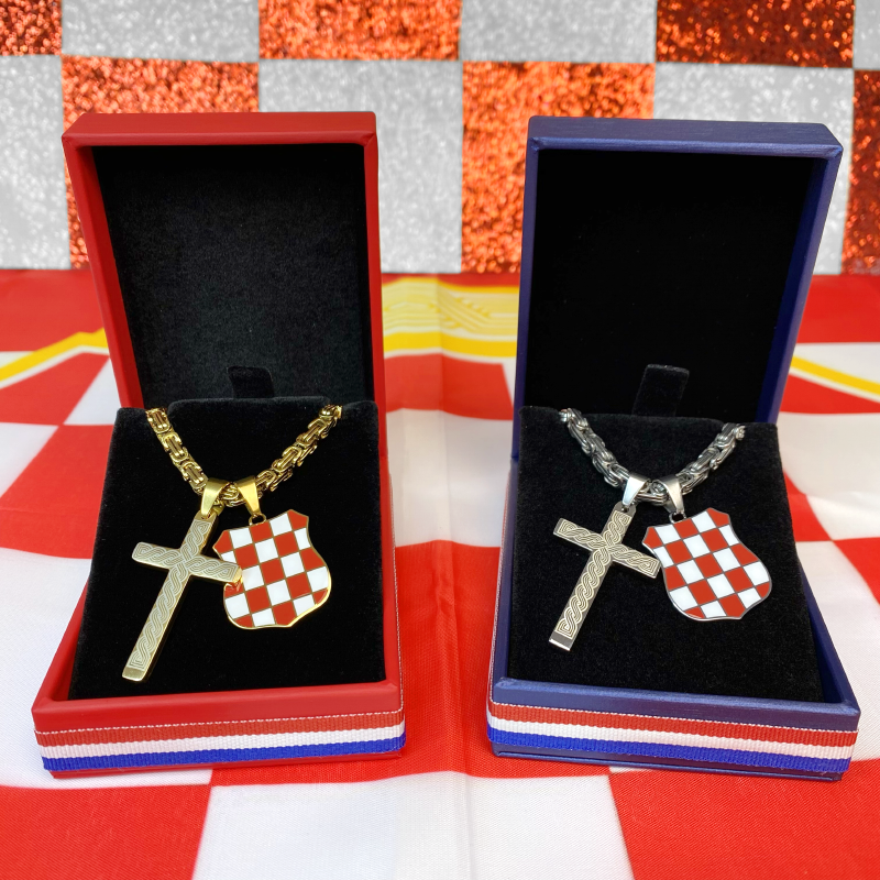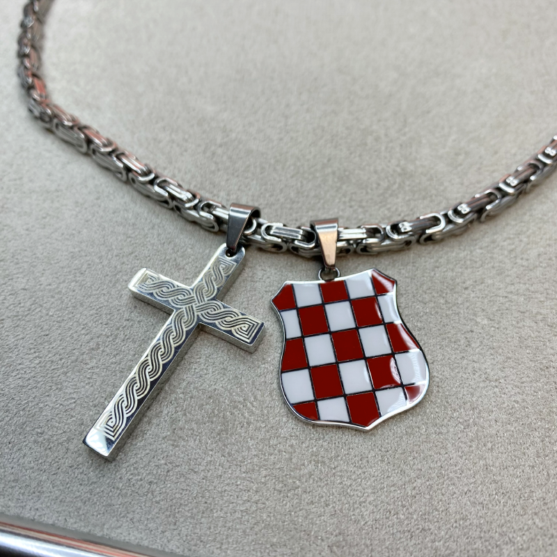 This necklace with the Herceg Bosna coat of arms without the crown pendant in enamel color and the braided (pleter) cross is a piece of Croatian jewelry that provides a strong historical and cultural expression to Croatians. A powerful symbol of Croatian heritage and faith — and a truly beautiful, meaningful gift. This Herceg Bosna necklace is made from durable stainless steel and comes in gold or silver color.