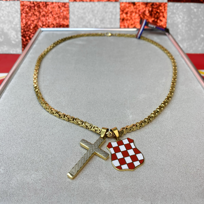 Lančić s privjeskom grba Herceg-Bosne bez krune u emajl bojama, uz privjesak križa s hrvatskim pleterom, komad je nakit koji spaja ljubav prema domovini i povijesti našeg kraja. Privjesci vise na elegantnom lančiću kraljevskog veza, koji upotpunjuje cijeli izgled. Ogrlica je izrađena od nehrđajućeg čelika i dostupna je u pozlaćenoj ili posrebrenoj varijanti.