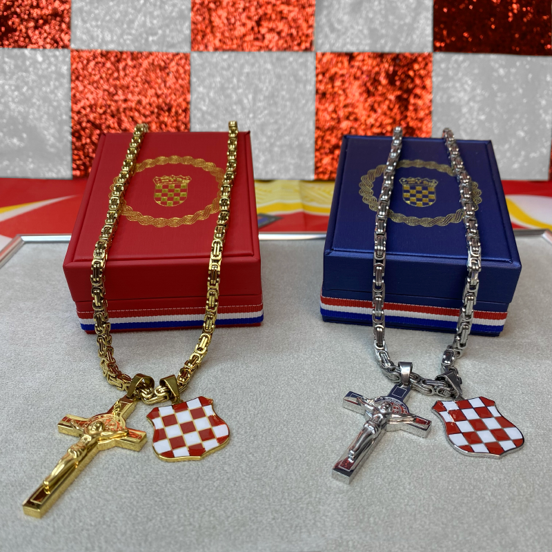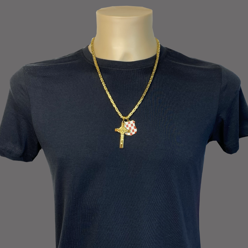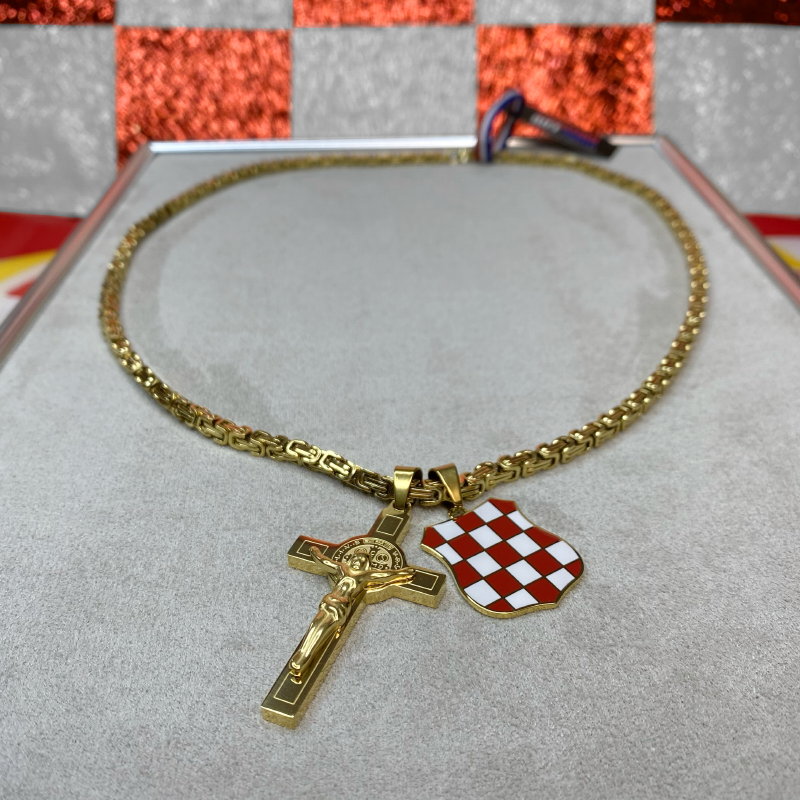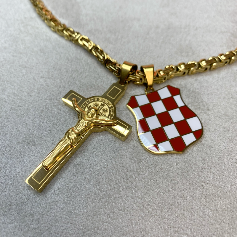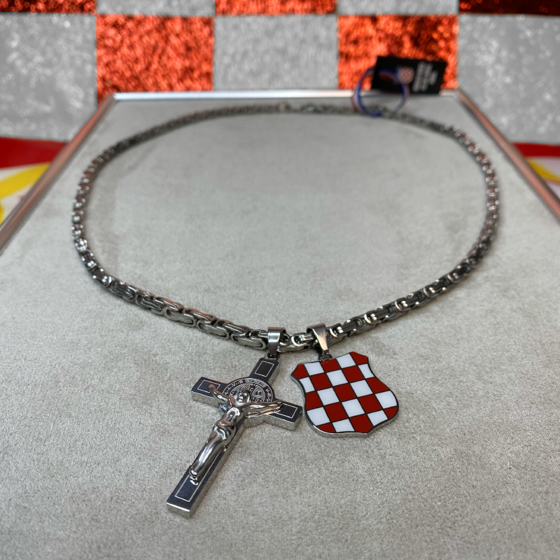 Ova ogrlica nosi privjesak grba Herceg-Bosne u emajl bojama, uz veliki križ s ugraviranom medaljom sv. Benedikta, sve na robusnom lančiću kraljevskog veza. Ima duboko značenje za svakog domoljuba i snažno izražava povijesni i kulturni identitet hrvatskog naroda. Ogrlica je izrađena od nehrđajućeg čelika i dostupna je u pozlaćenoj ili posrebrenoj varijanti.