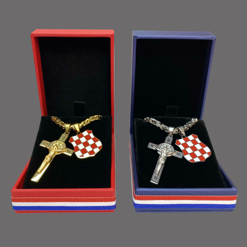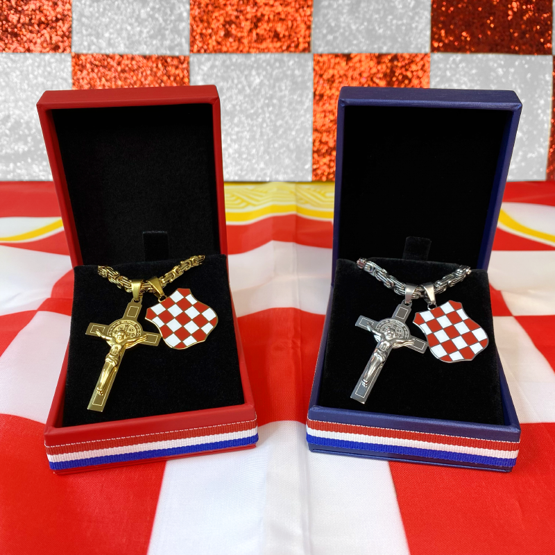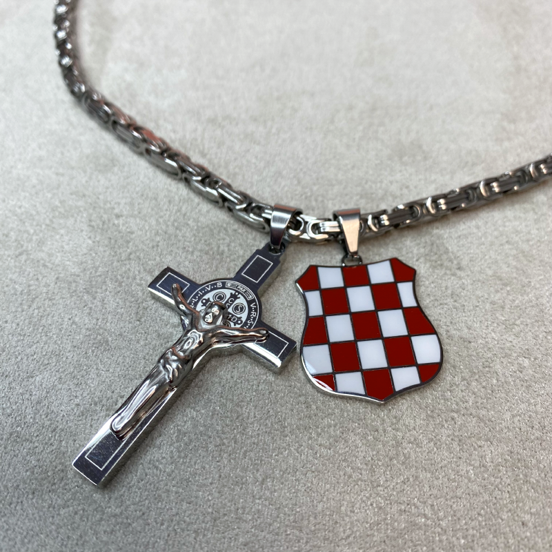 This necklace showcases the Herceg-Bosna coat of arms pendant alongside a stunning cross engraved with the St. Benedict medal, all set on a royal weave chain. A powerful symbol of Croatian heritage and faith and a truly beautiful, meaningful gift. This Croatian necklace is made from durable stainless steel and comes in gold or silver color.