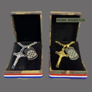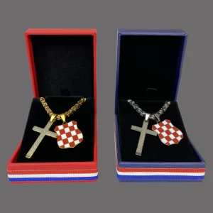 Ogrlica s privjeskom grba Herceg-Bosne u emajl bojama, na elegantnom lančiću kraljevskog veza, istinski je dragocjen komad Hrvatskog domoljubnog nakita! Ogrlica je izrađena od nehrđajućeg čelika i dostupna je u pozlaćenoj ili posrebrenoj varijanti.