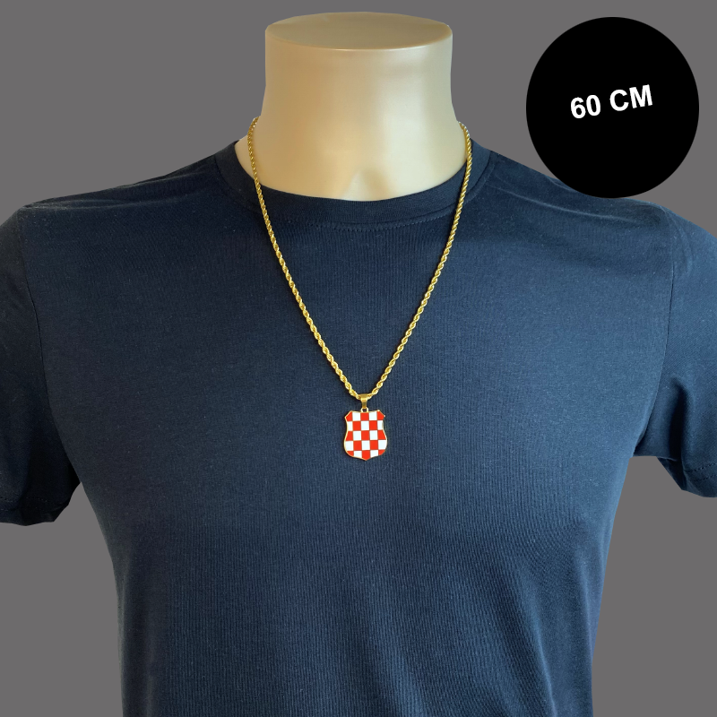 Lančić s privjeskom grba Herceg-Bosne bez krune u emajl bojama pravi je simbol ponosa koji svaki Hrvat mora imati! Privjesak grba krasi elegantan lančić pletenog veza, spoj tradicije i domoljublja. Ogrlica je izrađena od nehrđajućeg čelika i dostupna je u pozlaćenoj ili posrebrenoj varijanti.