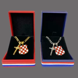 This necklace features the Herceg-Bosna coat of arms pendant adorned with the traditional pleter cross pendant. It’s a meaningful piece of Croatian jewelry that unites love for the homeland, faith, and cultural heritage. The pleter cross is a historic symbol of the Croatian people, found in ancient churches and monasteries throughout the medieval Kingdom of Croatia between the 9th and early 12th centuries. This Croatian necklace is made from durable stainless steel and comes in gold or silver color.