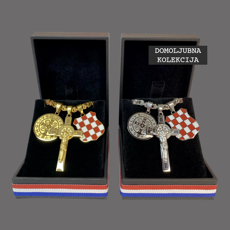 Grb Herceg Bosne u boji s križem i medaljom sv. Benedikta dio je naše Domoljubne kolekcije — nastale iz poštovanja prema hrvatskoj povijesti, vjeri i identitetu. Ogrlica spaja grb u emajliranim bojama i križ s ugraviranom medaljom sv. Benedikta na obje strane, dok zasebna medalja sv. Benedikta dodatno naglašava snažan kršćanski simbol zaštite i blagoslova.