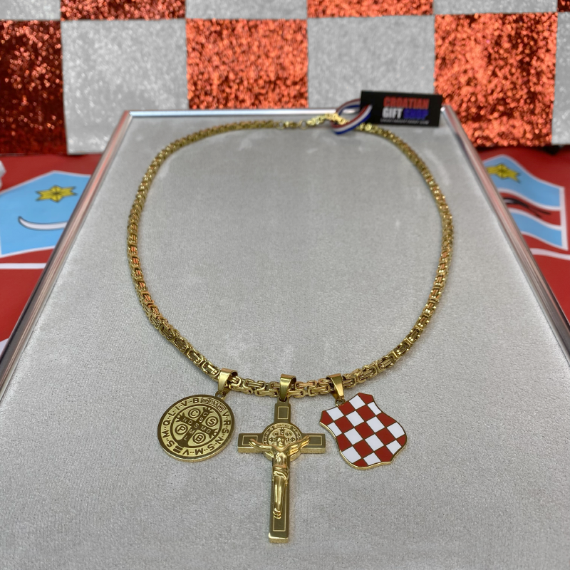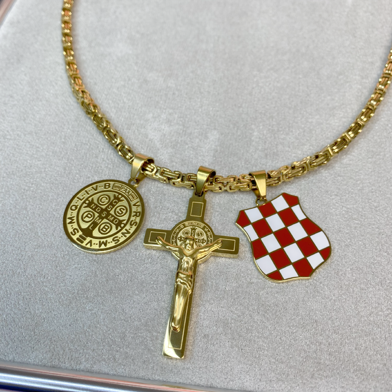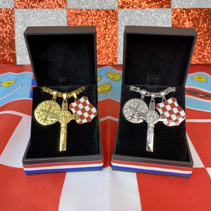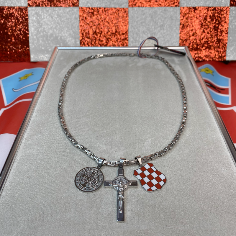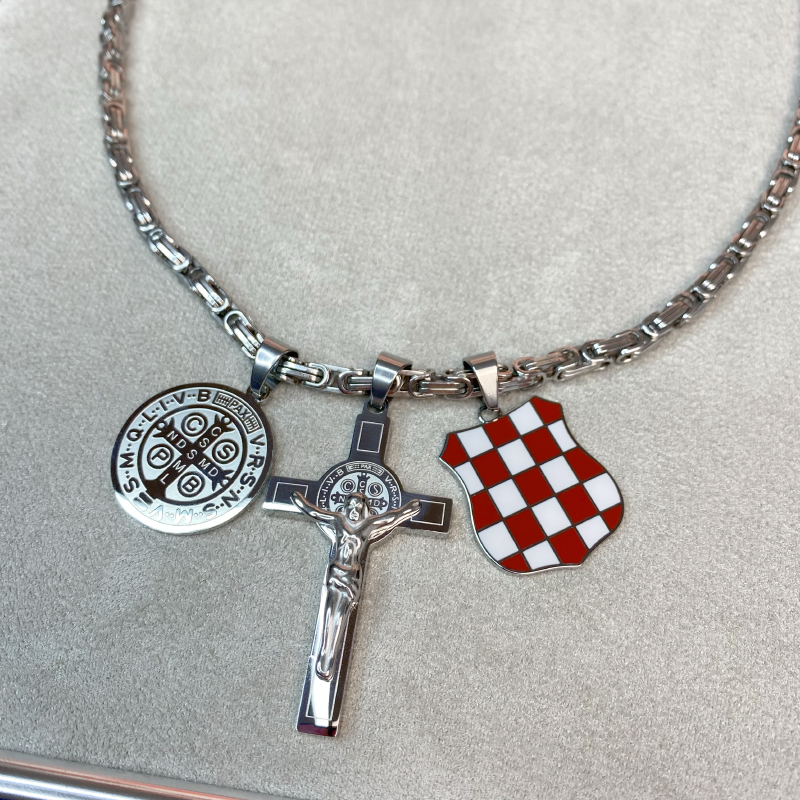 The Herceg Bosna Coat of Arms with a cross and the St. Benedict medal is part of our Patriotic Collection — created out of respect for Croatian history, faith, and identity. This necklace combines the coat of arms with a cross featuring an engraved St. Benedict medal on both the front and back, while a separate St. Benedict medal further emphasizes a powerful Christian symbol of protection and blessing.