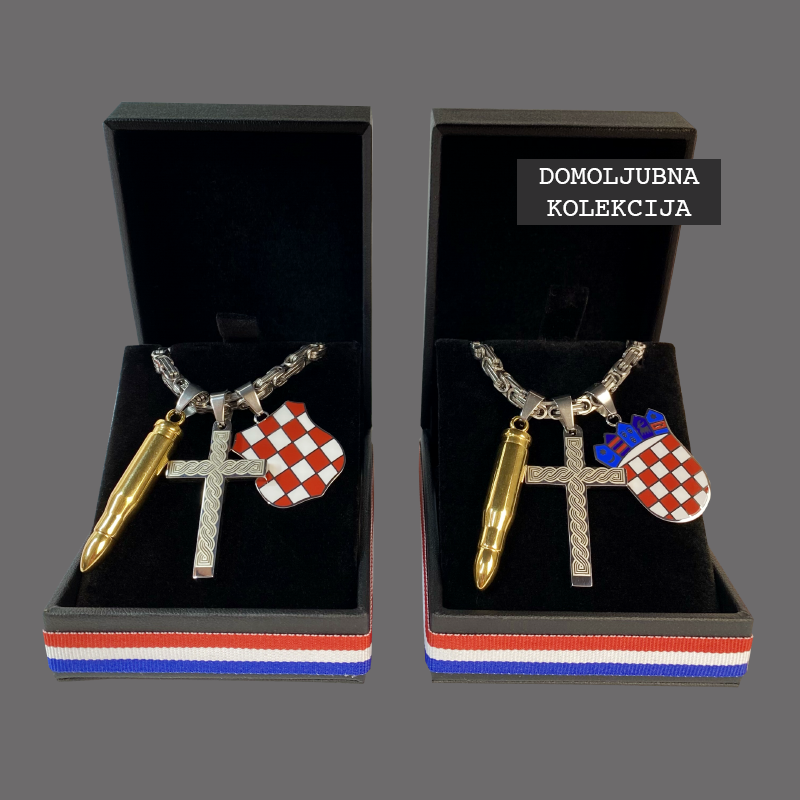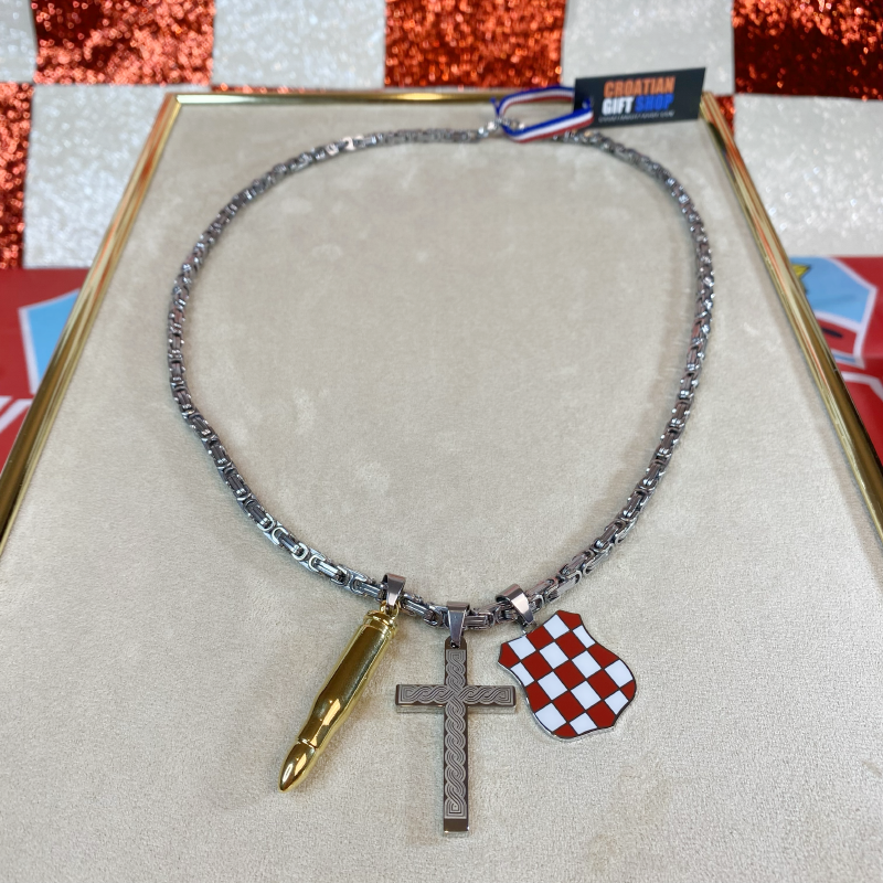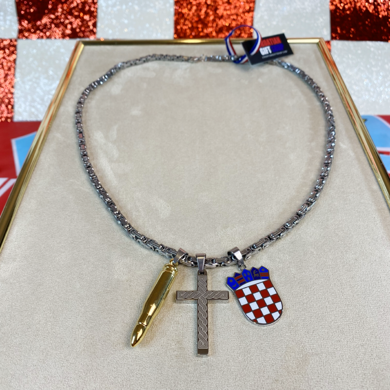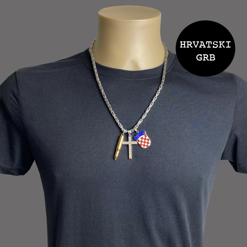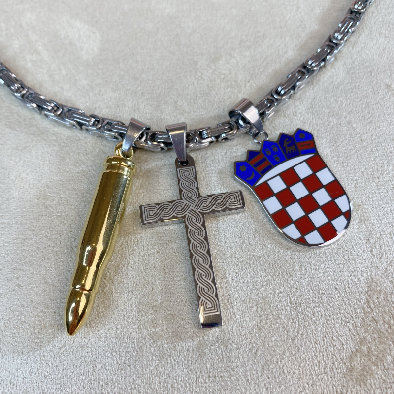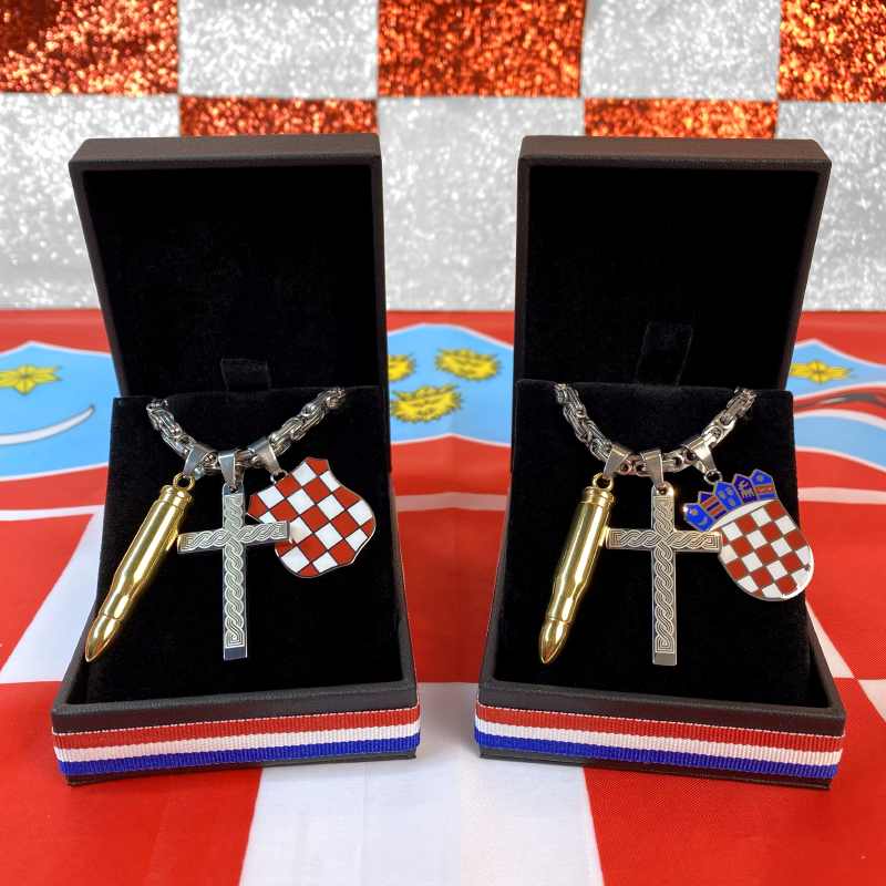 Emajlirani grb bogat je detaljima i živih boja, pleter križ podsjeća na duboke korijene hrvatske baštine, dok privjesak u obliku metka daje ogrlici snažnu simboliku.