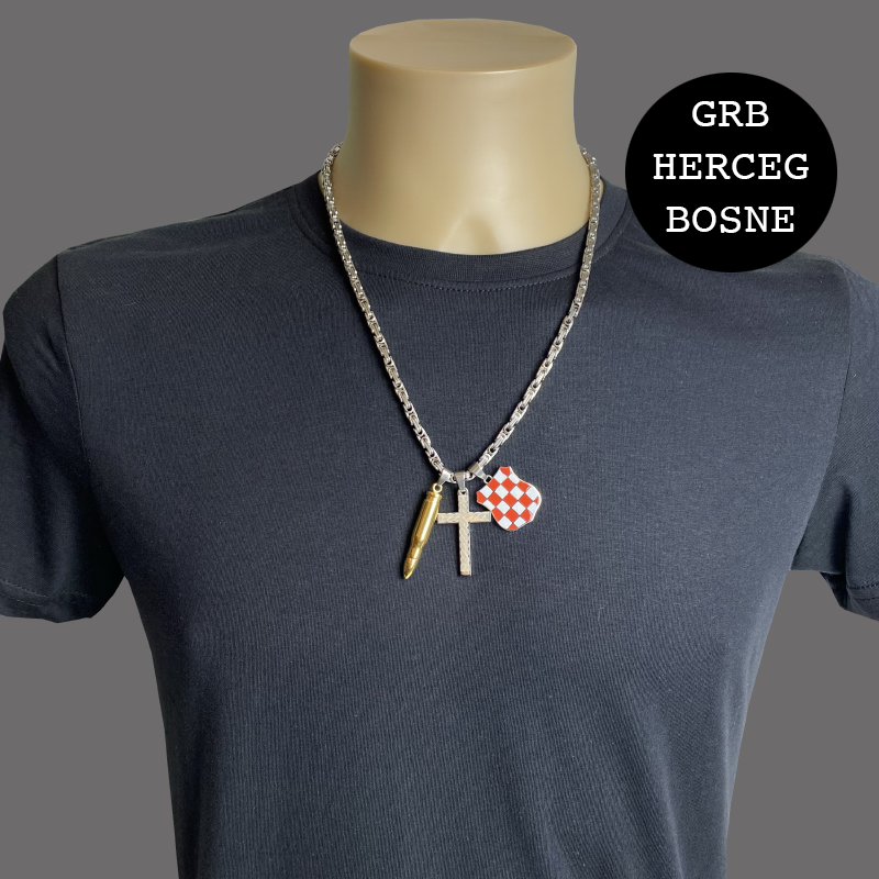 Grb u boji s pleter križem i imitacijom metka dio je naše Domoljubne kolekcije — nastale iz poštovanja prema hrvatskoj povijesti, identitetu i domoljublju. Ova ogrlica dolazi u dvije varijante: s hrvatskim grbom u boji ili s grbom Herceg-Bosne u boji.