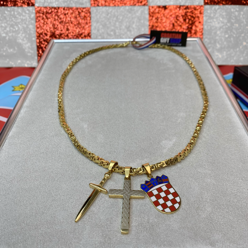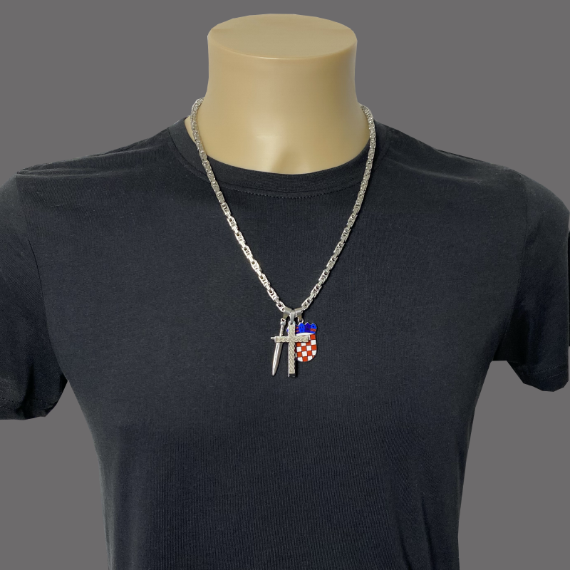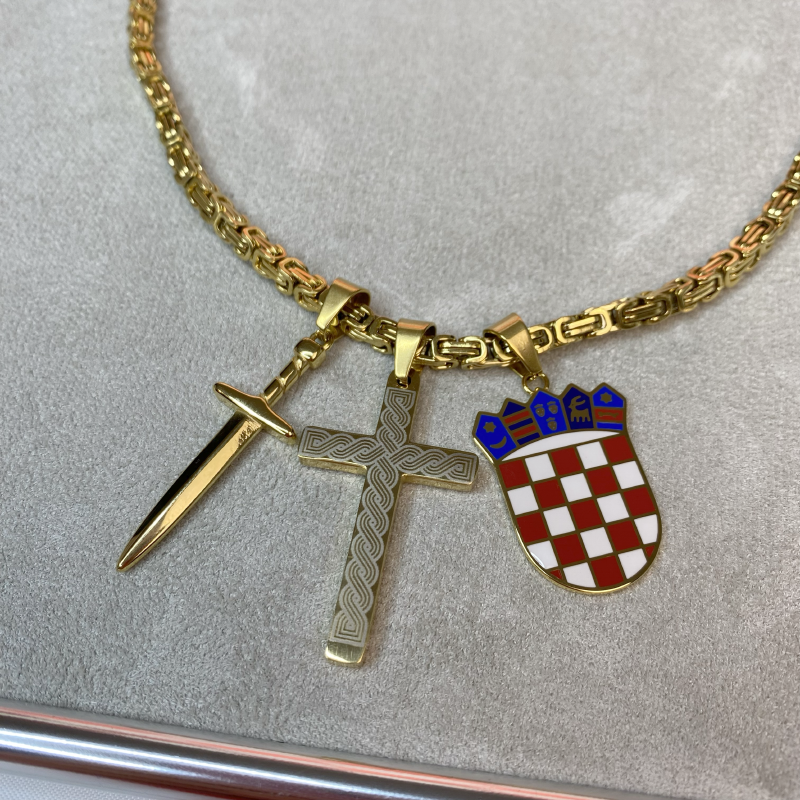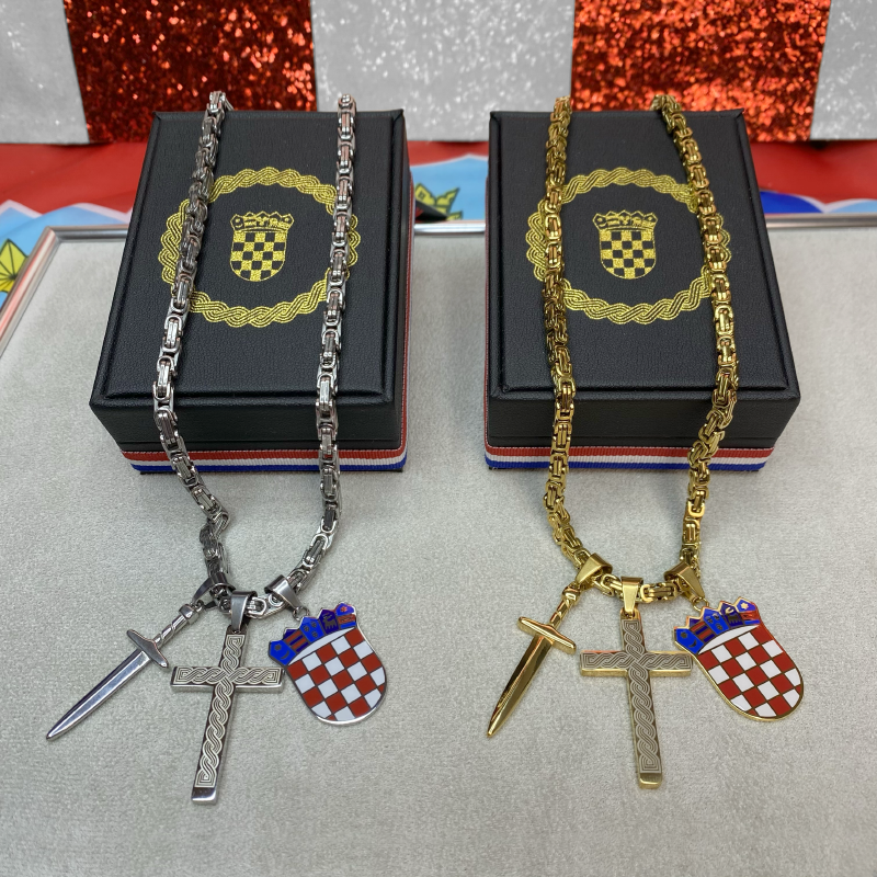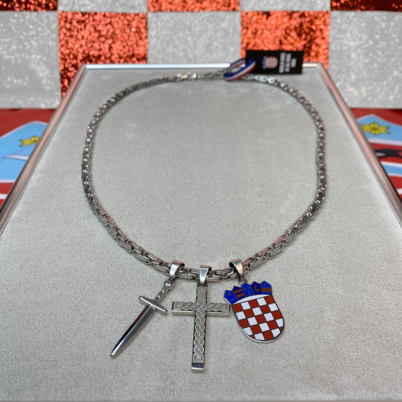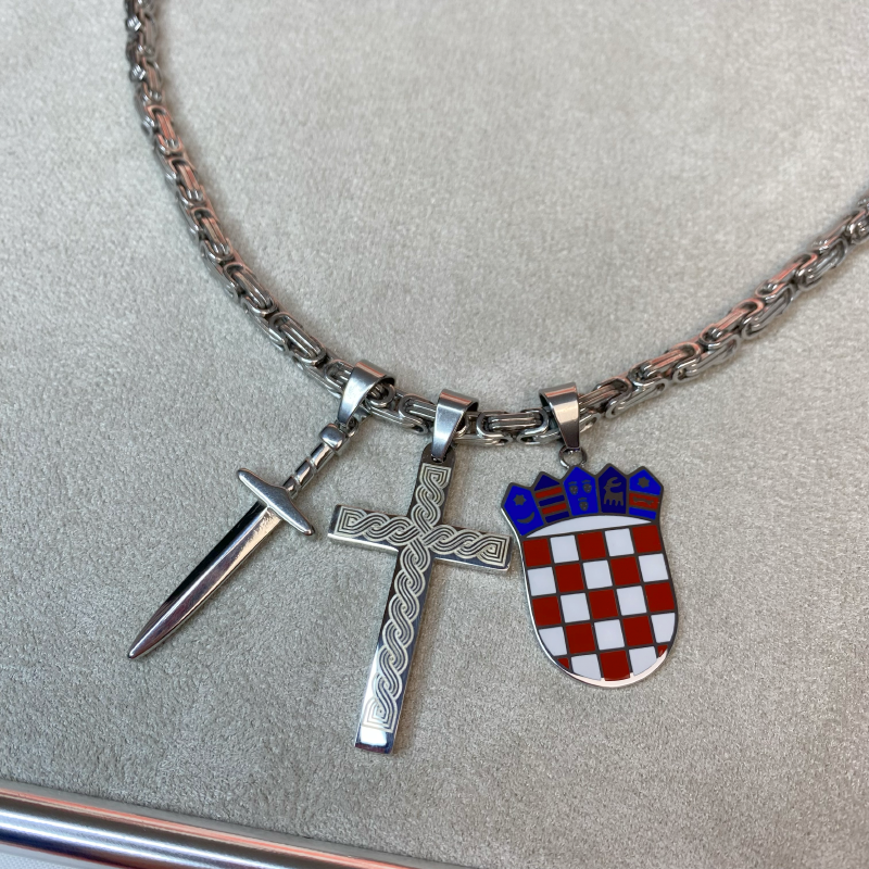 The Croatian coat of arms in color with pleter cross and sword is part of our Patriotic Collection — created out of respect for Croatian history, faith, and identity. This necklace symbolizes the strength of a warrior from the era of Croatian kings — honor, courage, and devotion to the homeland. Three pendants unite into one powerful piece: the Croatian coat of arms in color as a sign of belonging, the pleter cross as a symbol of Christian heritage, and the sword as a mark of warrior honor.