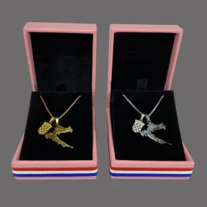 Lančić s privjeskom karte Hrvatske i križem ukrašenim dijamantima od kubičnog cirkonija nosi poseban sjaj Domovine uz svaki vaš korak. Privjesak s kartom Hrvatske detaljno je ugraviran imenima Hrvatskih gradova, čineći ovu Hrvatsku ogrlicu snažnim simbolom ljubavi prema domovini. Lančić je izrađen od nehrđajućeg čelika i dostupan je u pozlaćenoj ili posrebrenoj varijanti.