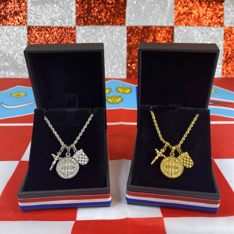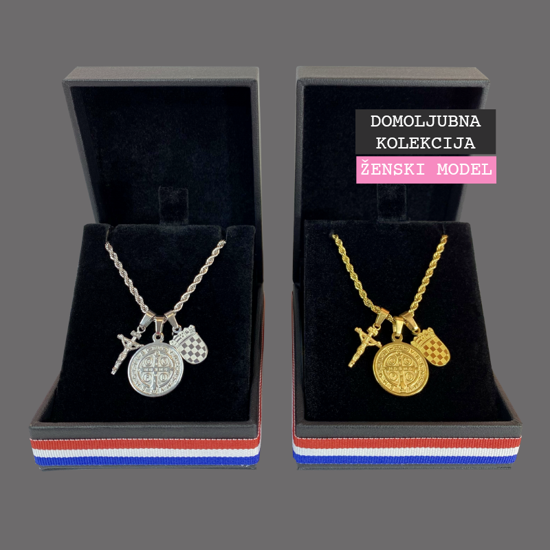 Mali Hrvatski grb s križem Isusa i medaljom sv. Benedikta dio je naše Domoljubne kolekcije — nastale iz poštovanja prema hrvatskoj povijesti, vjeri i identitetu. Ovaj model osmišljen je kao nježnija i elegantnija varijanta, prilagođena ženskom stilu.
