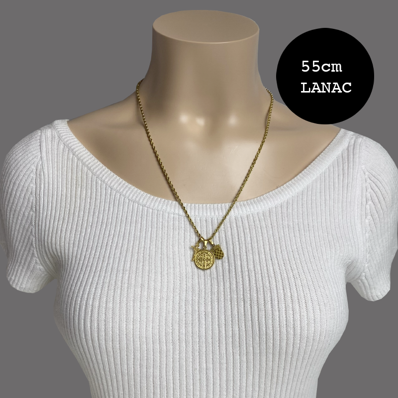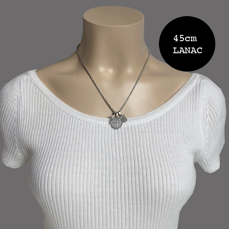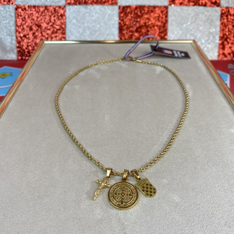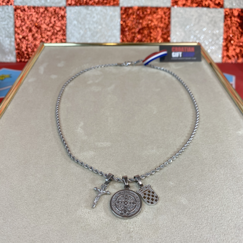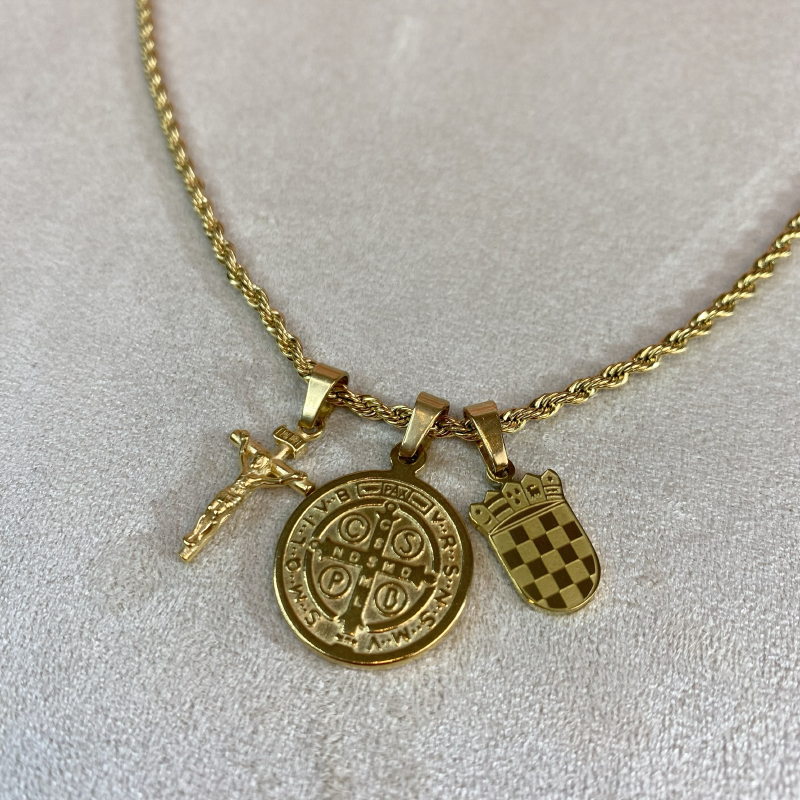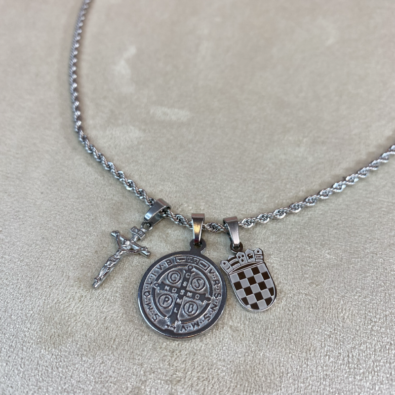 Grb daje ogrlici profinjen izgled, dok križ s prikazom Isusa i medalja sv. Benedikta nose duboku duhovnu poruku zaštite, vjere i blagoslova. Kombinacija detalja čini ovu ogrlicu elegantnom, ali simbolički snažnom.