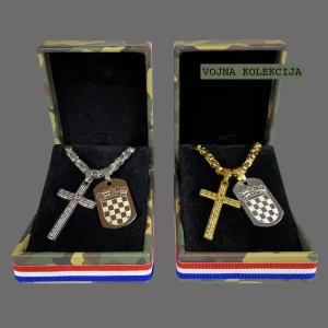 Lančić s graviranim hrvatskim grbom na vojnoj pločici i križem na kojem je ugravirana medalja Sv. Benedikta savršena je kombinacija vjere i domoljublja. Privjesci vise na robusnom lančiću kraljevskog veza, koji dodatno naglašava snagu i tradiciju koju ovaj Hrvatski nakit nosi. Ogrlica je izrađena od nehrđajućeg čelika i dostupna je u pozlaćenoj ili posrebrenoj varijanti.
